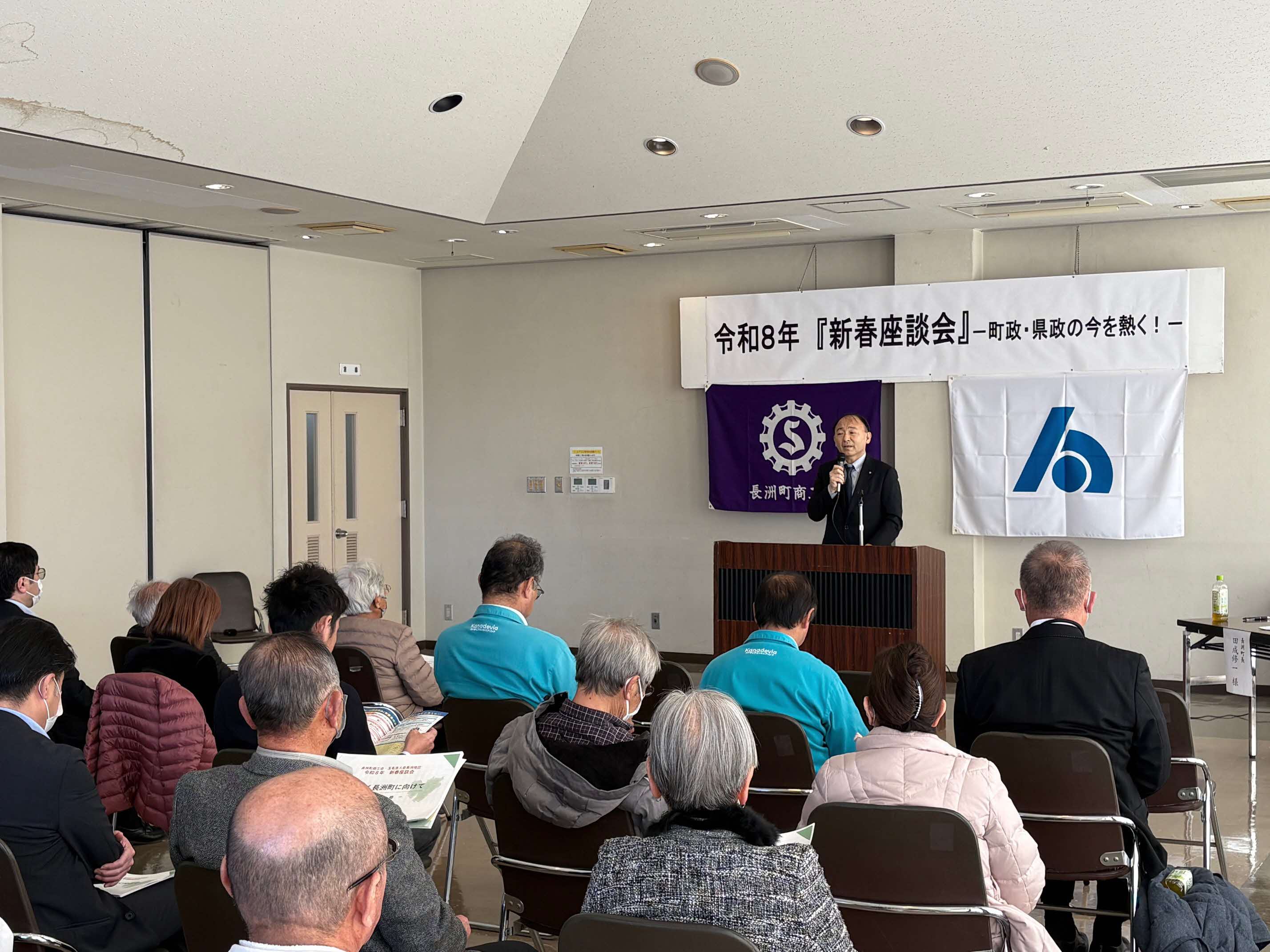今年の新春座談会は、「町政・県政の今を熱く!」をテーマに、内野幸喜県議会議員と田成町長による講話が行われました。